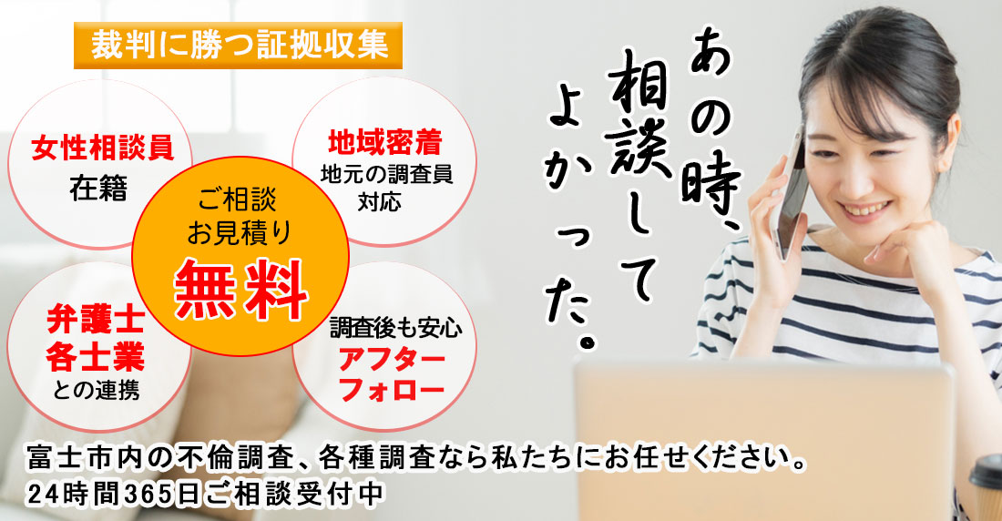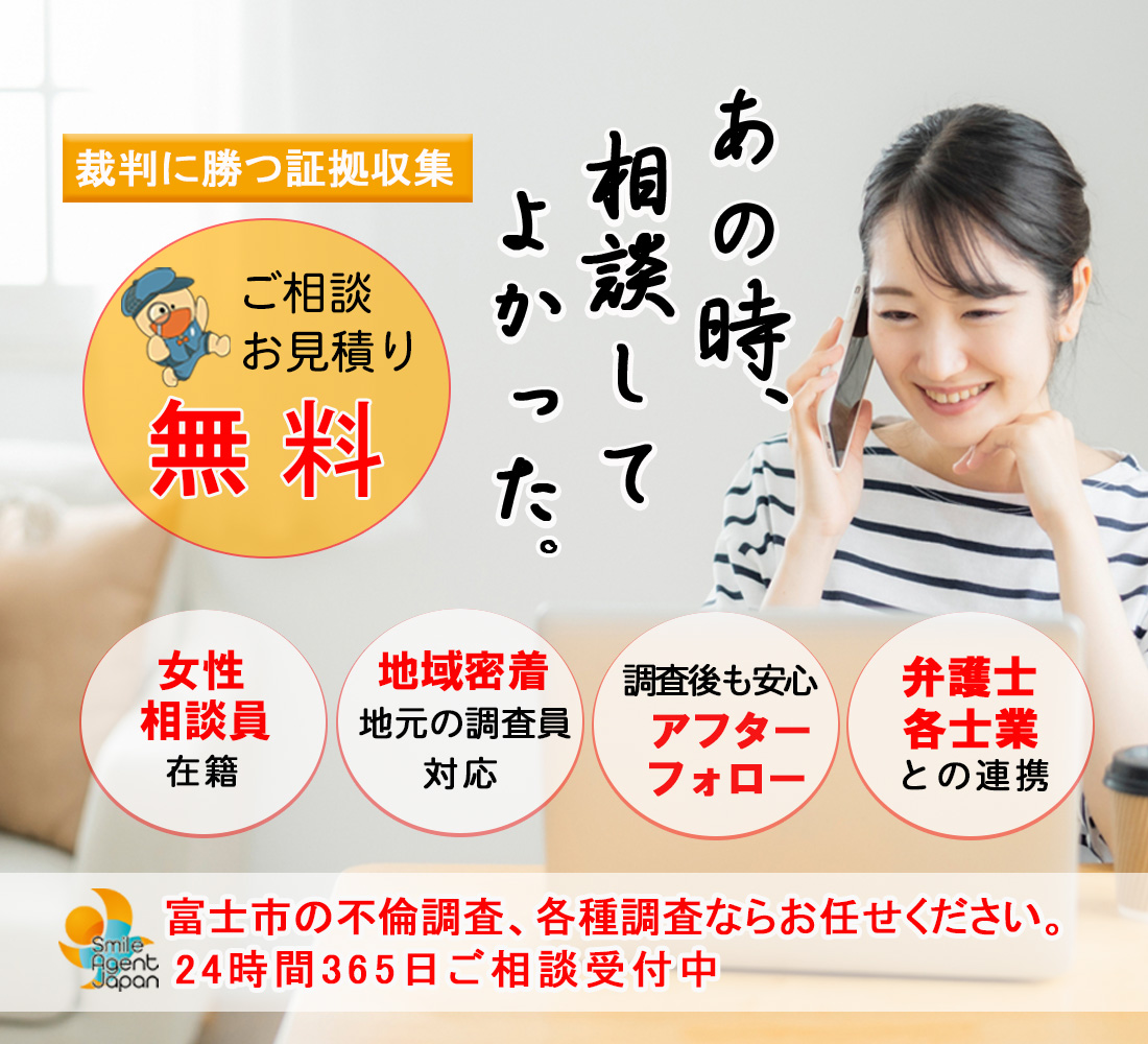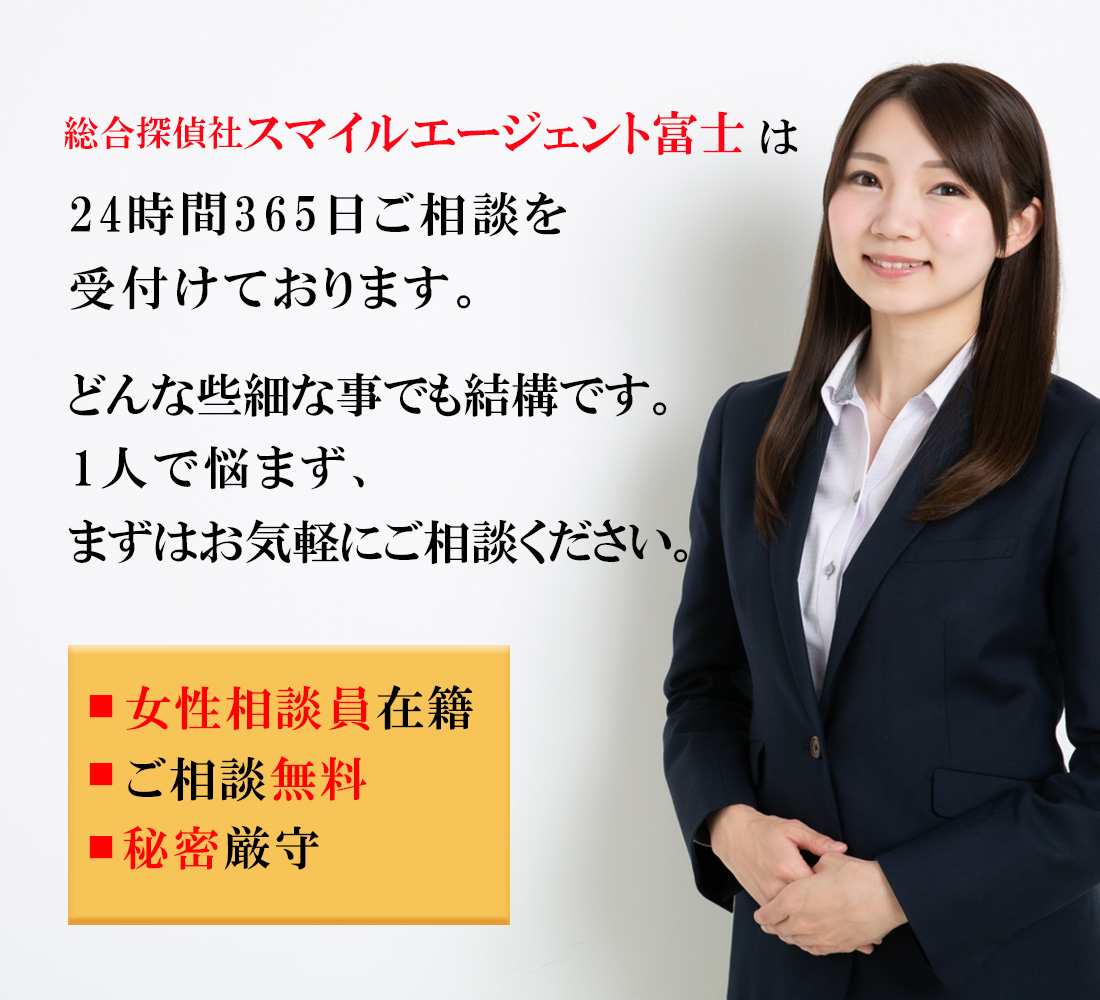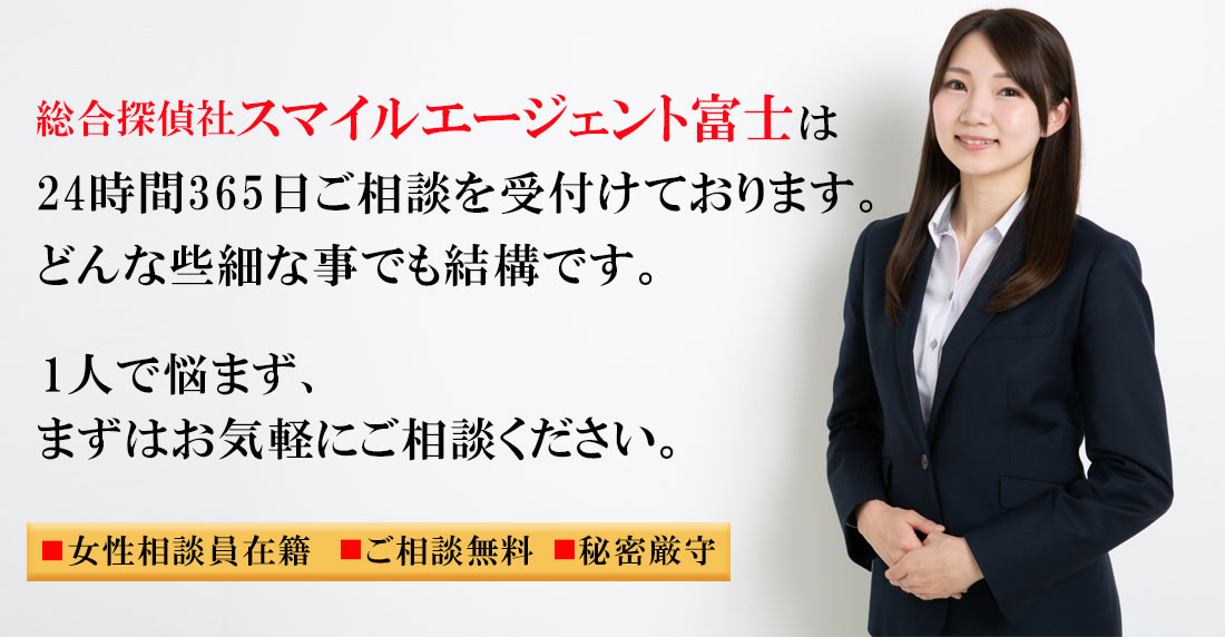 富士市で不倫・浮気調査や行方調査、ペット捜索などの各種調査で探偵をお探しの際にはご相談・お見積りは無料となっておりますので一度、総合探偵社スマイルエージェント富士までお気軽にご相談ください。