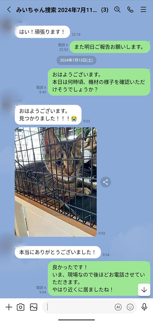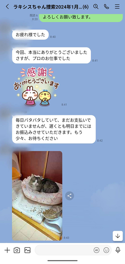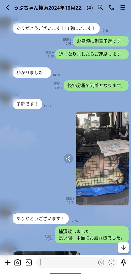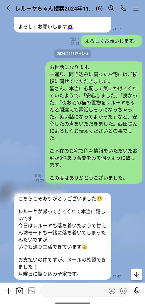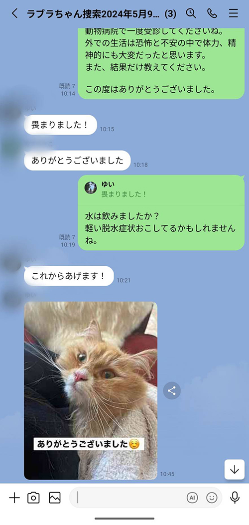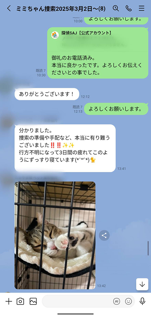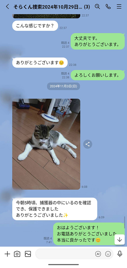 猫や犬などのペットが無事に保護もしくは発見したら、すぐにご連絡いたします。
