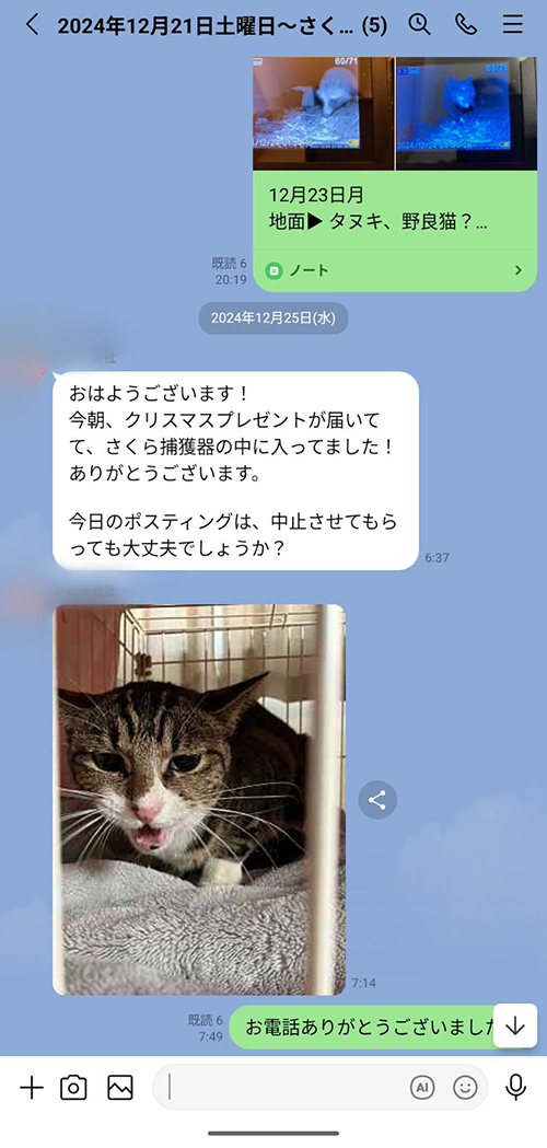 また、猫は明け方と夕方の薄暗い時間帯に活発に行動するため(薄明薄暮性)、通りそうな場所に特殊な捕獲器や動体検知カメラを設置して対応します。