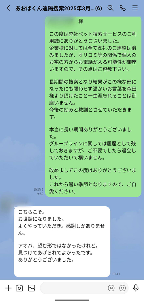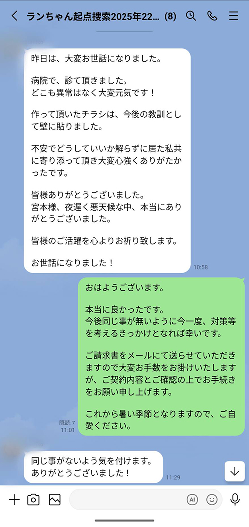もし調査期間内にペットが発見できなかった場合は、それまでの状況をご報告した上で、調査の継続・終了をご判断いただきます。