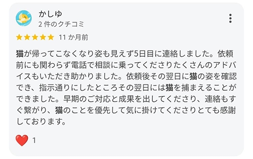ペット捜索のご依頼をいただいたお客様から、たくさんのお喜びの声をいただきましたので一部ご紹介いたします。
